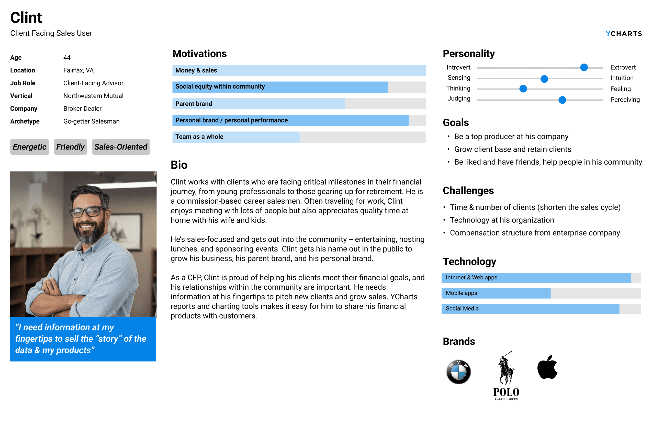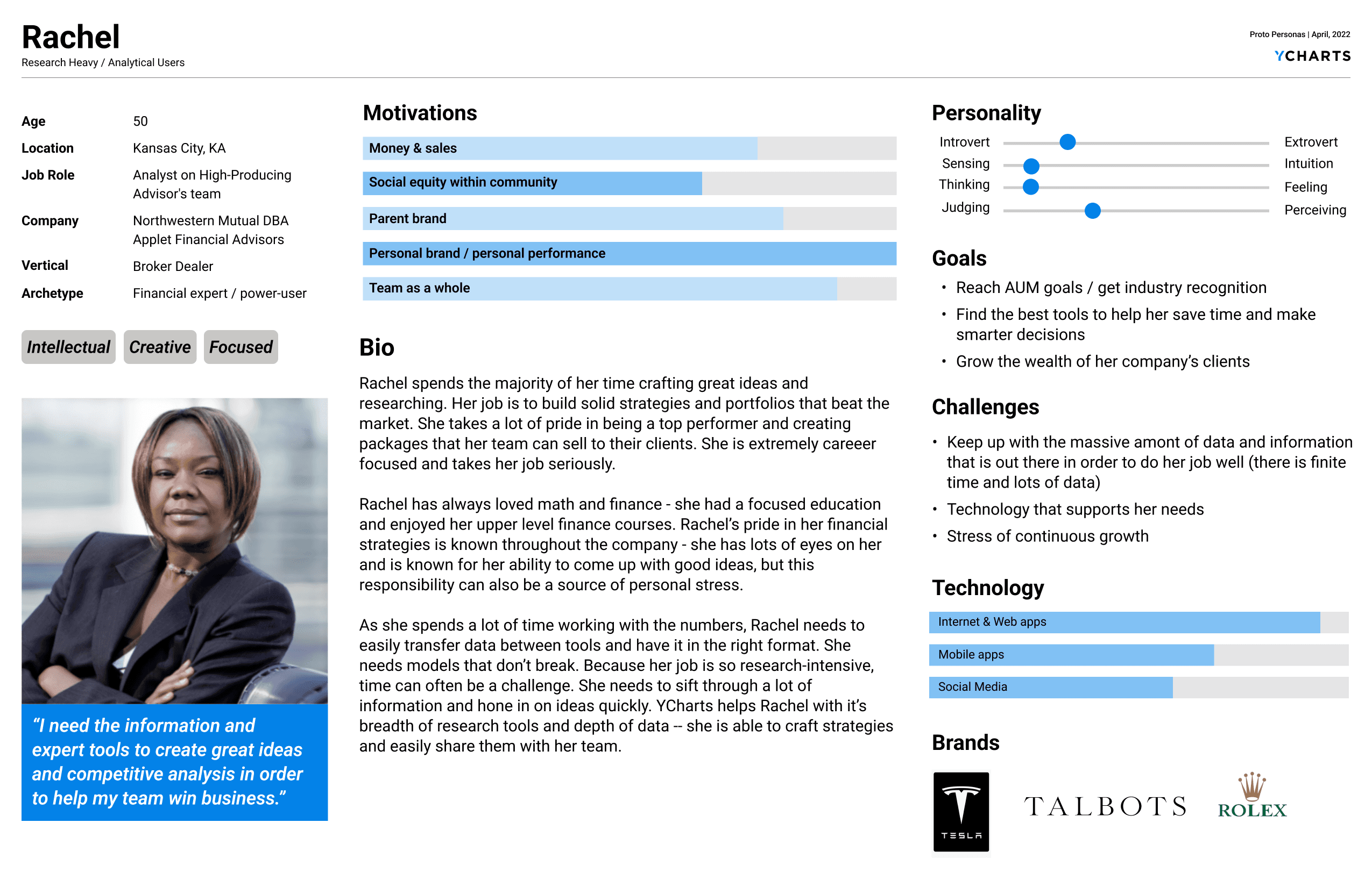 We developed user personas of the financial advisors that use our product, ensuring the needs and goals of those we’re designing for are consistent. We used these documents to ask leading questions like "How would an analyst like Rachel use this?" and "How would this benefit Clint in sales?".