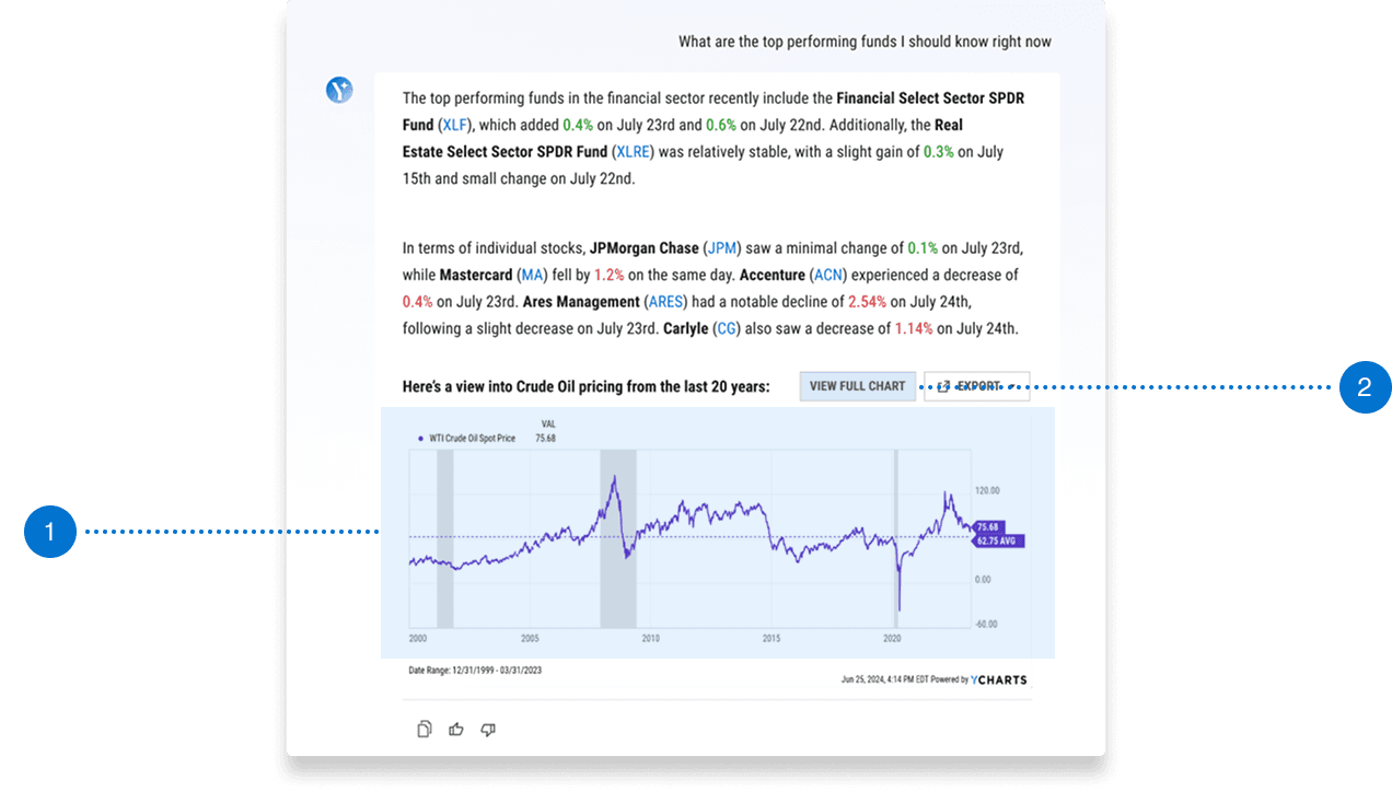 Advisors love charts, but creating them takes time. AI automations allow advisors to generate custom data visualizations from simple inputs, dramatically decreasing average task times. To integrate this capability into the flow of the chat tool’s conversation thread, I followed existing AI tool design conventions of displaying rich inline content such as graphs to reduce unfamiliarity and friction.