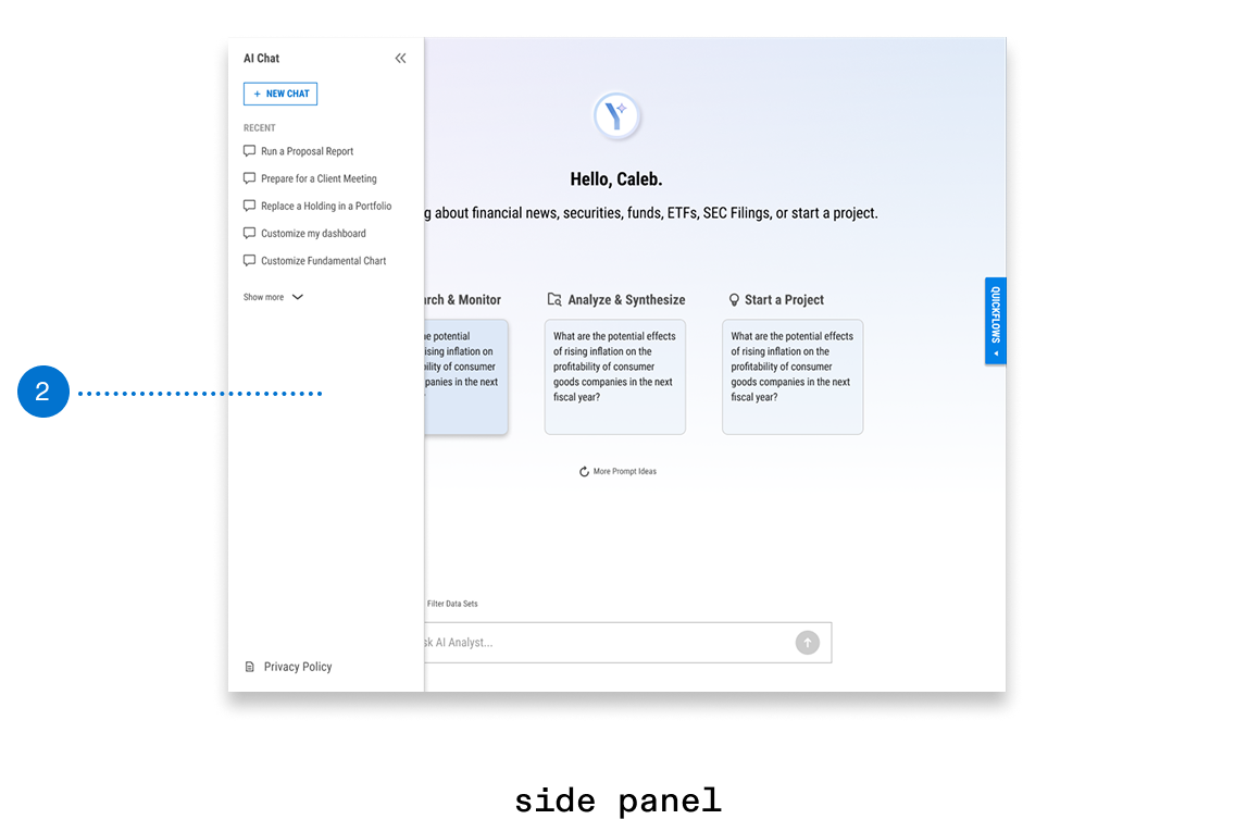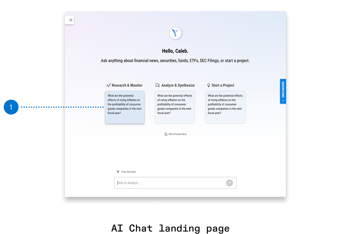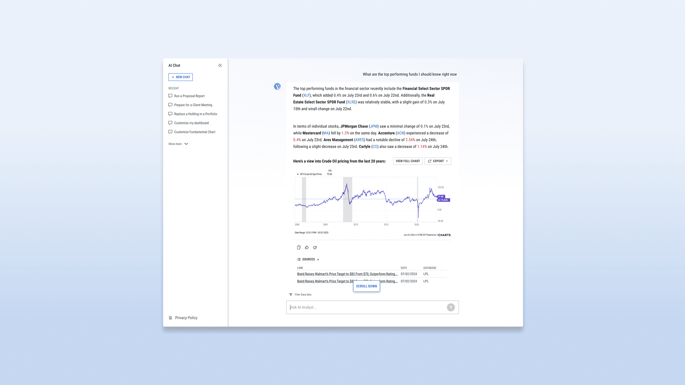 As the Principal Designer of this product, I conducted competitive research to understand AI applications across the financial space to identify design opportunities. Through rapid, iterative testing with internal stakeholders, we explored multiple creative directions for an intuitive chat-based interface with AI-enhanced analytical tools that advisors can rely on.