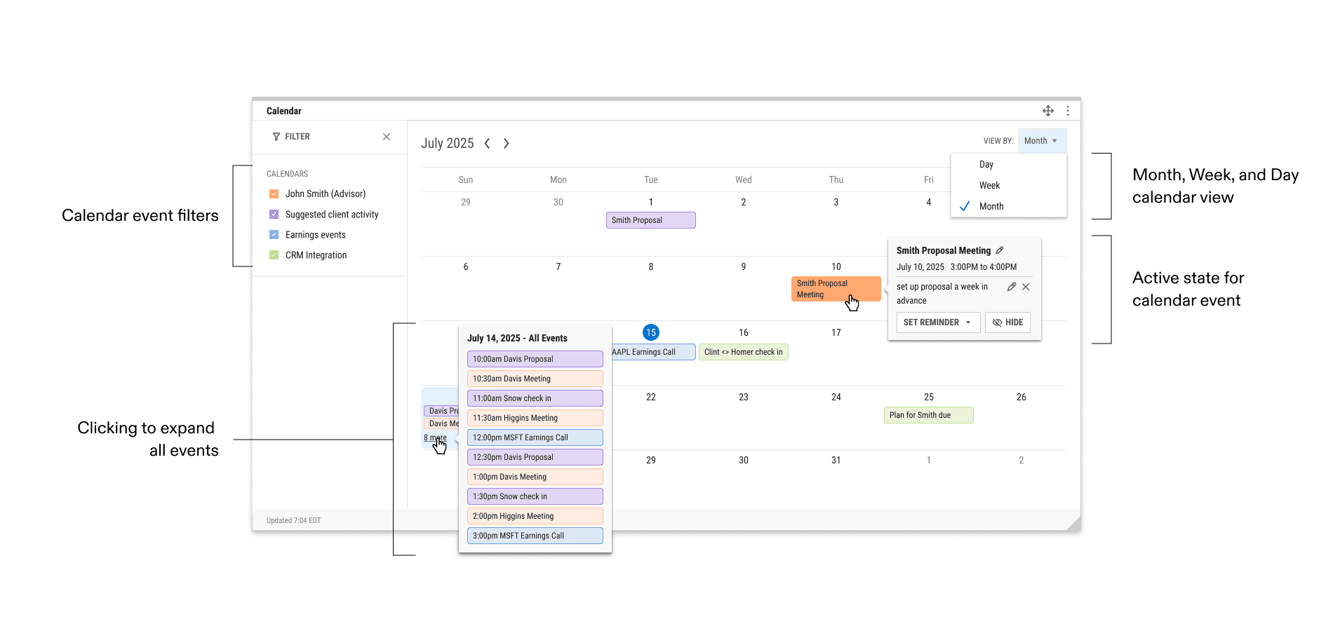 We designed and created calendar within the Client Asset Management Platform that tracks advisor events, client activity, and integrates external calendars. Design conventions of the most widely used calendar interfaces were followed because familiarity reduces friction.
