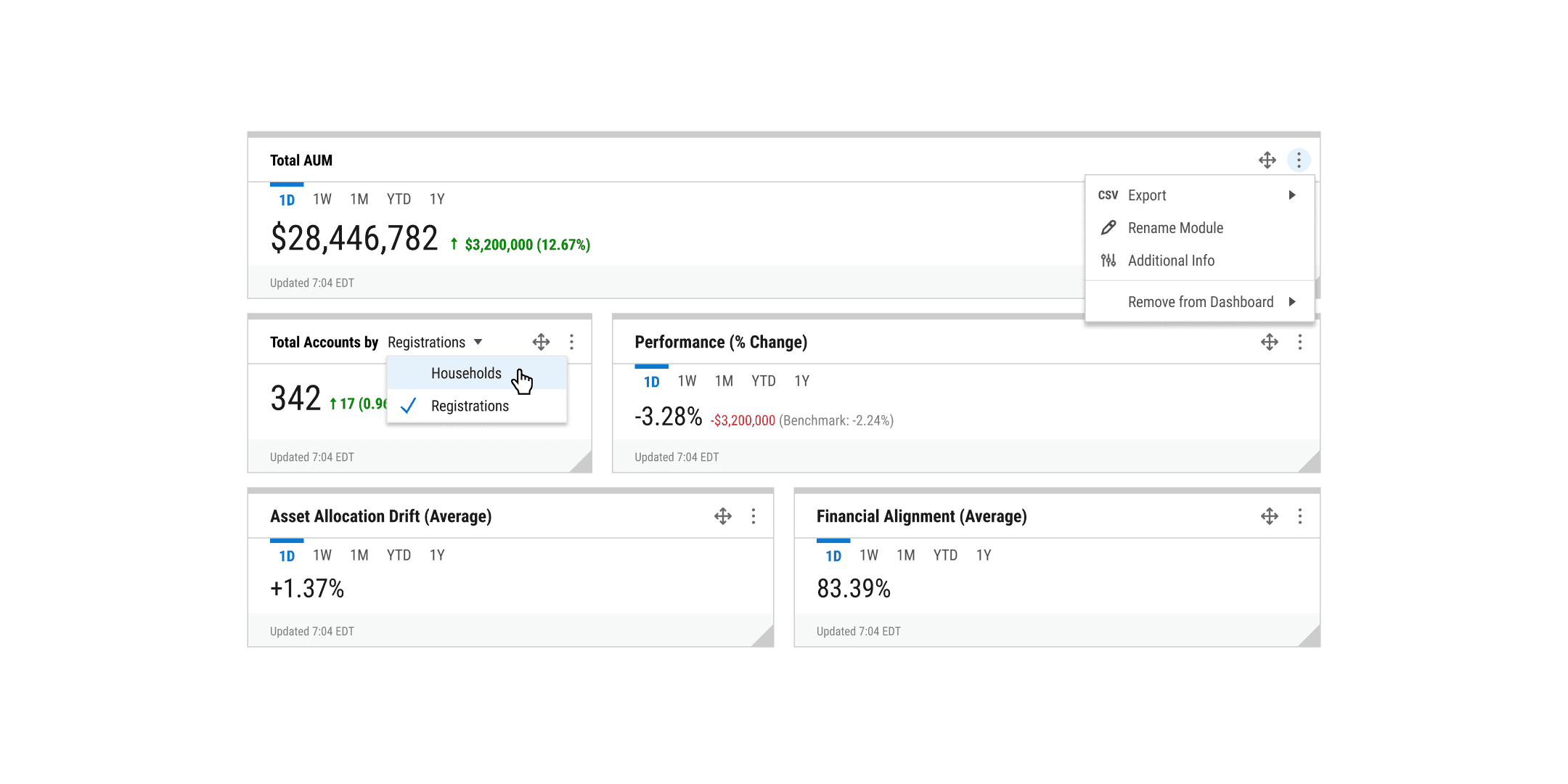 The client asset management platform (CAMP) contains modules housing financial information that visualize an advisor's book of business through different lenses. An interface with numerous data modules each doing different things will inevitably have design issues, which were overcome by refining the modules' relationships with one another. We were always asking "what would a financial advisor with 100+ clients want to see about their book of business?""