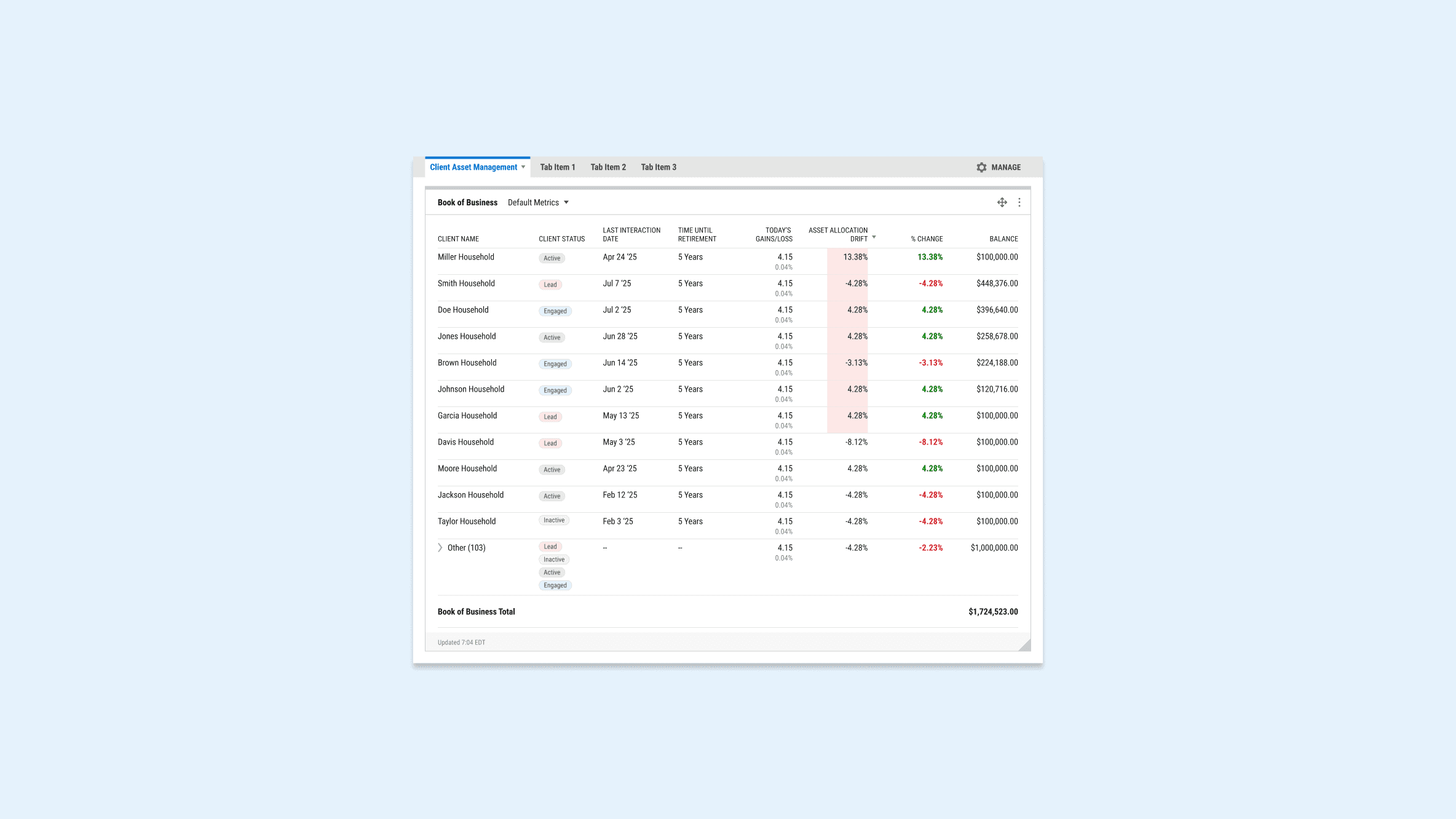 Project management needed other higher-level data visualization modules to be above the book of business that advisors would want to see first. This led to the book of business being too far down the page.