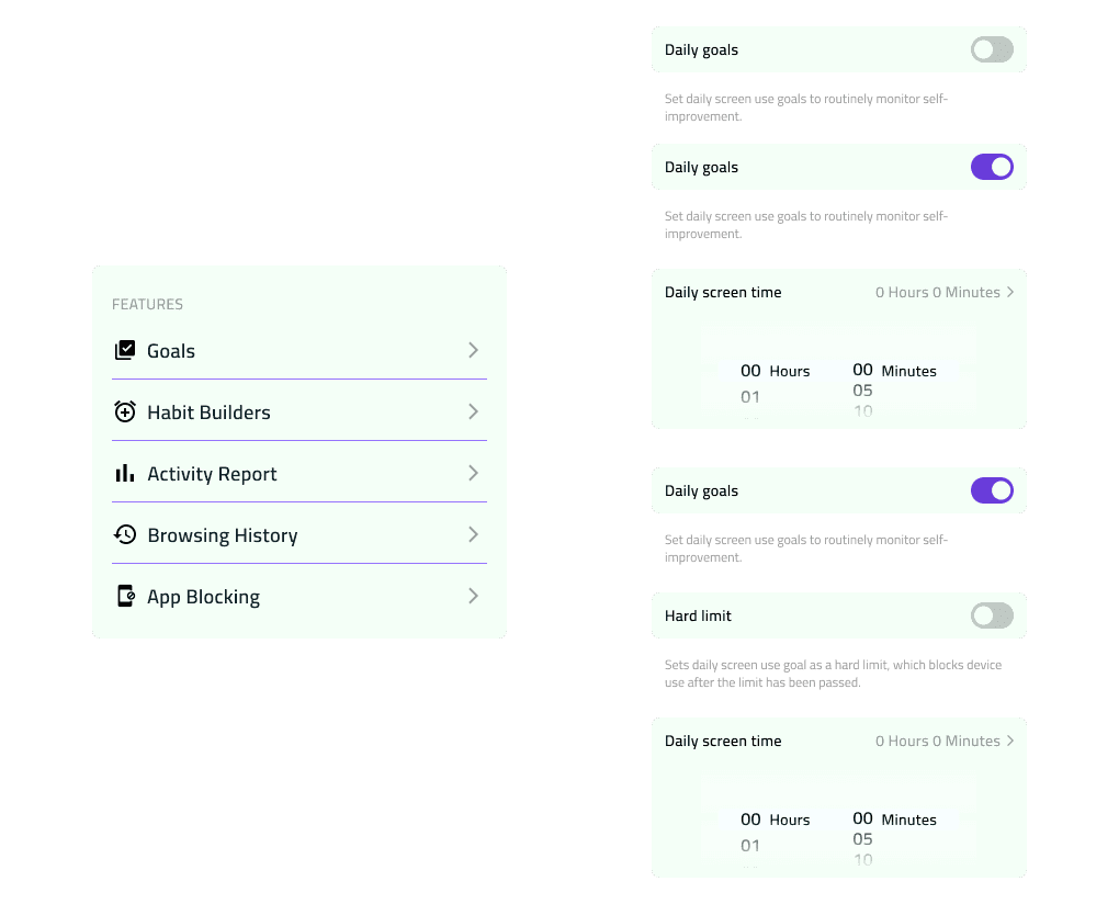 set time-specific use goals on a daily, weekly, or app-specific basis. goals can be enforced with a digital nudge or hard limit.