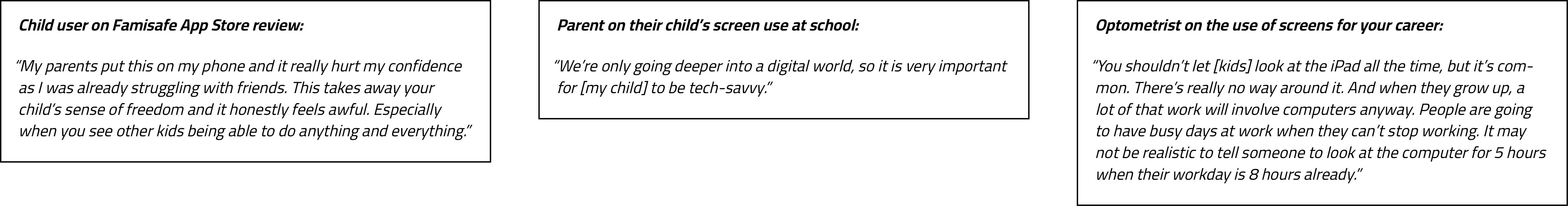 Alongside initial online research, users and experts were asked questions regarding their general experiences with screen use. Users interviewed included two college students and a family of three with a 10yo child. Experts interviewed included a high school and elementary school teacher that both taught through COVID, and an optometrist.